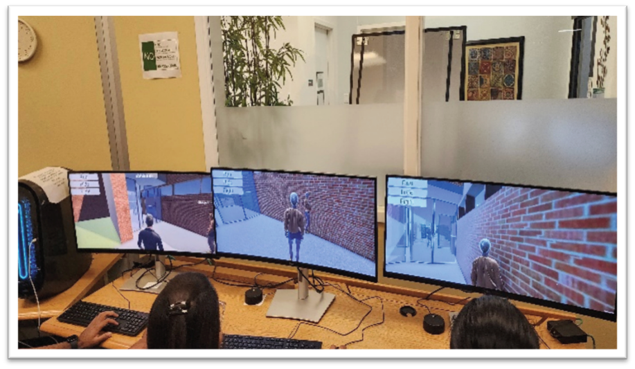 Active Shooter Response VR Modules for Training and Decision MakingCurrent Students: Pranav Moses, Keerthana Srinivasan, Johannas Meela Katikala, Past Students: Nanda Gowri Ganta, Bala Chikkala, Saivishal Thota, Sri Chandra Dronavalli, Phillip Devreaux, Pranay Rajeev, Dexter Ballerda, Manik R Arrolla Sri Teja Bodempudi, Srikanth Guntupalli, Abhaya Ladalla, Navatha Maloth, Pranitha Seemalamudi, Lavanya Nidamanuri Emergency response and active shooter training drills are essential for preparing for emergencies, as we cannot predict when they will happen. While progress has been made in understanding human behavior, unpredictability, human motion synthesis, crowd dynamics, and their connection to active shooter events, challenges still remain. We have developed an immersive collaborative virtual environment (CVE) for active shooter response for a campus building. The CVE was designed for corner cave and MetaQuest/oculus rift head mounted display to give the user a complete immersive experience of the campus. We are currently building the immersive collaborative virtual environment (CVE) for active shooter response at discovery park building on UNT campus. The immersive virtual campus environment can be also helpful to understand the campus environment and better know and navigate the university campus leaving the users no stress of walking or coming to campus just to view the campus. Immersive collaborative virtual reality environment also offers a unique way for training in the emergencies for campus safety. The participant can enter the collaborative virtual reality environment setup on the cloud and participate in the evacuation drills which leads to considerable cost advantages over large scale real life exercises. Our contribution also lies in our approach to combining computer simulated agents (AI agents) and user-controlled autonomous agents in a collaborative virtual environment for conducting emergency response training for security personnel's and building occupants. Thus, it will allow for more effectively employing existing resources in preparing and training for an event and have more effective investment strategies. The emergency response training and exercises are the paths to implementing emergency operation plans (EOP) and translating them into action. 1) Immersive Active Shooter Response Module for UNT Building using MetaQuest 3 and Unity 3D (Run, Hide, & Fight)The immersive collaborative virtual reality environment for performing active shooter training scenarios using MetaQuest 3 head mounted display. The collaborative immersive environment is implemented in Unity 3D and is based on run, hide, and fight mode for emergency response. We have conducted user studies to evaluate the effectiveness of our CVE module (immersive and non-immersive) for active shooter response training and decision-making using the Group Environment Questionnaire (GEQ), Presence Questionnaire (PQ), System Usability Scale (SUS), and Technology Acceptance Model (TAM) Questionnaire. The results show that the majority of users agreed that the sense of presence intrinsic motivation, and self-efficacy was increased when using the immersive emergency response training module for an active shooter evacuation environment. 2) Immersive Security Personnel module for Active Shooter response using ALERRT (Advanced Law Enforcement Rapid Response Training) frameworkThe security personnel module was developed grounded in the ALERRT (Advanced Law Enforcement Rapid Response Training) framework. The security personnel training module was further organized into four sub-modules: 1) Situational assessment module, 2) Individual officer intervention module, 3) Team Response Module, and 4) Rescue Task Force module. The VRI modules were developed using the Unity 3D game engine and SketchUp modeling software, enabling the construction of both immersive (head-mounted display) and non-immersive (desktop-based) training environments. This combination of technologies allowed the research team to create visually accurate building replicas, support multi-user interactions, and implement dynamic simulations that respond to user behavior, leading to a highly adaptable and realistic training platform.